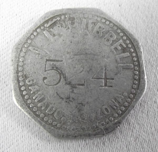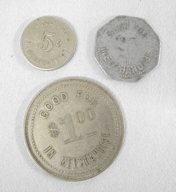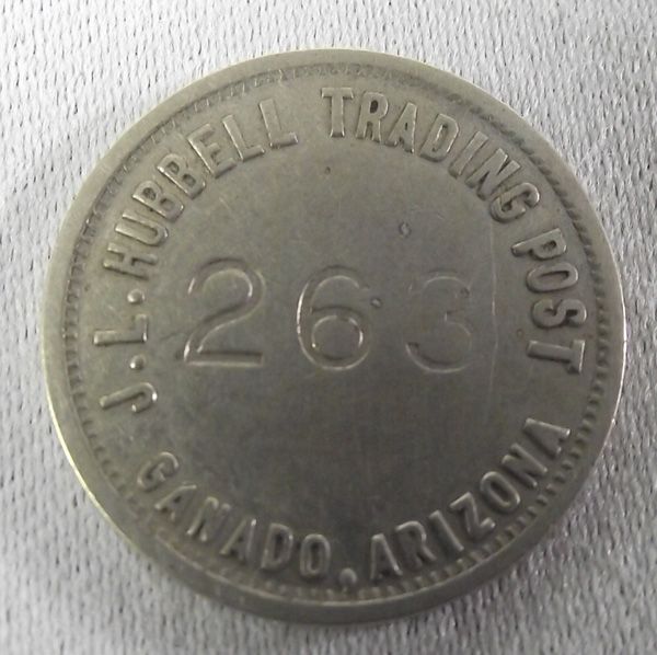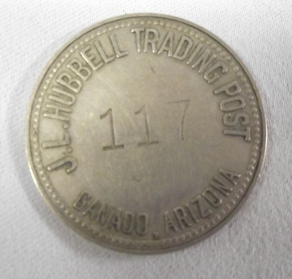 3 JL Hubbell Trading Post, Ganada Arizona, Apache County Trade Tokens. Round $1.00, Six Sided 25 Cent, Round 5 Cent Token.