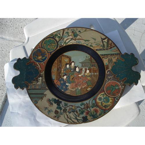This is a wonderful antique Japanese Plate or plaque. These is slight wear on the paper but this is to be expected for Papier Mach'e. The back of the plate has a thin chip at edge that is not visible from the front of the plate . The Lady on the left lower side is holding a scroll with a signature at the top of the page. This is a real work of art.