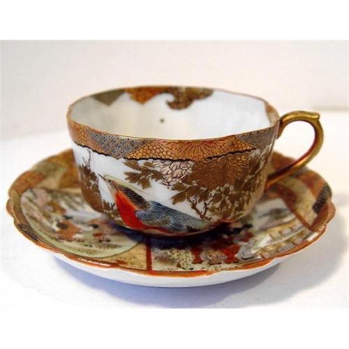 I would catergorize the cup & saucer as Kutani porcelain. Extremely well painted with fine & intricate detail. Both, cup & saucer, are works of art, with birds and geishas. Please, take your time to see the photos, they would describe the details you better than me.