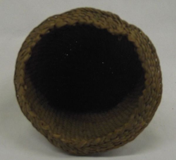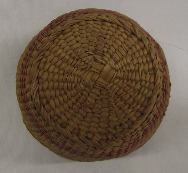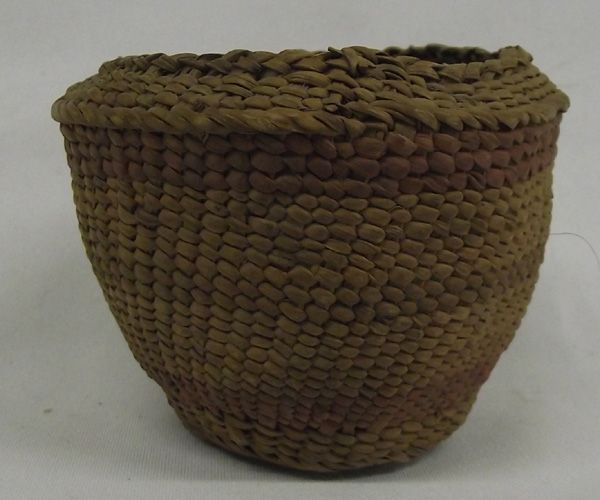 Yakima tapering oval basket made from tightly woven reed grass crafted by members of the Yakima Nation (Eastern WA State) c 1900. Measures approx. 3.25''H x 4.25''W