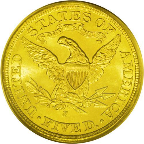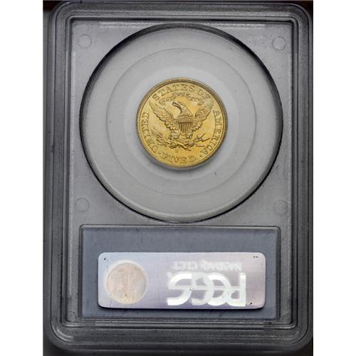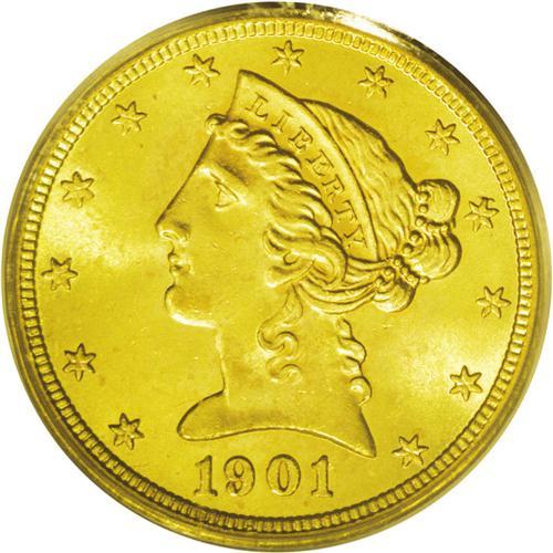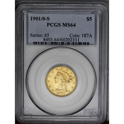 <B>1901/0-S<$5> MS64 PCGS.</B></I> FS-006. A lovely green-gold and peach near-Gem that possesses dazzling luster and has a particularly clean reverse. The upper right curve of the underdigit 0 is evident near the peak of the second 1 in the date. Struck prior to the era of hubbed dates, and one of the last overdates to fall outside this category.