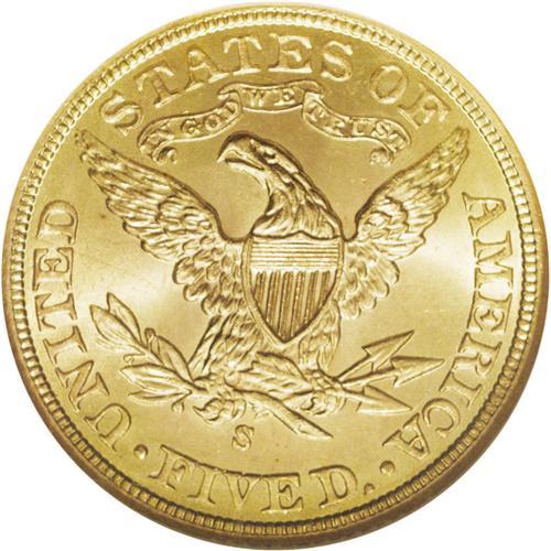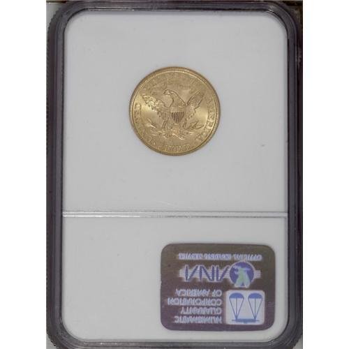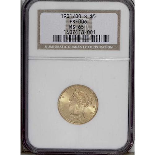 <B>1901/0-S $5 MS65 NGC.</B></I> FS-006. The upper left curve of the underdigit 0 is obvious. Booming luster sweeps this sharply struck yellow-gold Gem. The reverse is especially unperturbed. Perhaps the only 20th century manually punched overdate. Later overdates, such as the 1909/8 double eagle, are the product of different dated hubs. Census: 24 in 65, 4 finer (10/06).<BR><I>From The James Paul Collection.</B></I><BR><BR><b>Shipping:</b> Coin/Currency (<a target="_blank" href="http://www.heritageauctions.com/common/shipping.php">view shipping information</a>)