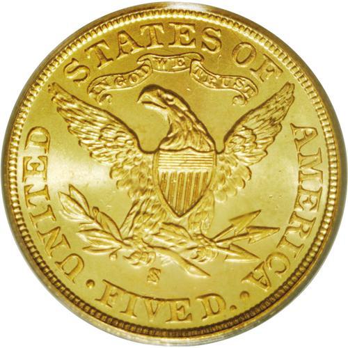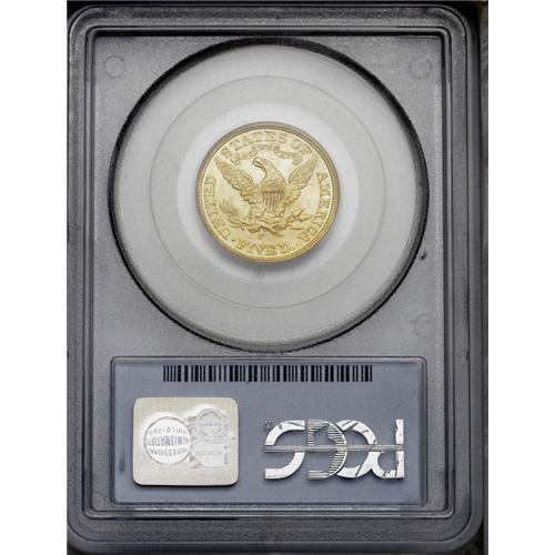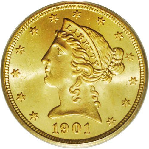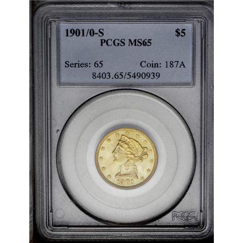 <B>1901/0-S<$5> MS65 PCGS.</B></I> A wonderful example of this overdate issue, and one of the finest seen. The undertype 0 in the date is clearly defined along the upper right side of the second 1. Apparently the engraver was able to partially efface the 0, enough so to use this obverse die. Discovered in 1973 by Ted Clark, and widely publicized since that time. Considerably difficult to obtain in Gem grades, the present coin should delight the successful bidder for its radiant luster and well struck devices. Examination will find a scattering of ticks, and a thin die crack from the point of bust to the first star, which reappears through a couple of stars on the left. Population: 9 in 65, 2 finer (3/06). <BR><BR><B>Important notice:</B> Heritage usually auctions material at the rate of 200-250 lots per hour. On some occasions eBay Live bid software or the Internet may not be able to keep up with the pace of the auction. We recommend placing a realistic absentee bid now as insurance to avoid disappointment. Occasionally the auctioneer may eliminate or reject an eBay Live bid, and the auctioneer may also reopen a lot after the close of the eBay live bidding (usually because we missed an audience bid), and may reject your bid even if it shows you as the winning bidder. By bidding via eBay Live, you agree that Heritage may award the lot to another bidder at its sole discretion under the circumstances described above or any other reasonable circumstances. Since eBay bids are not shown to us until we open the lot on the floor, we treat those bids just like floor bids. In most cases the floor responds before the eBay bid is presented to us, due to Internet lag time, so for consistency we have made it a policy that floor bids are always considered first over tie eBay live bids. Also please note that all Heritage lots purchased through eBay Live carry a 20% Buyer's Premium. Please make sure you read the Terms and Conditions before you bid. This lot is being auctioned in conjunction with a live floor auction by Heritage Galleries & Auctioneers. All final auction and invoice information will be supplied by Heritage Galleries & Auctioneers, and all other information should be considered preliminary. Lot:2846 <BR><BR><B>Winning Notification and Billing:</B> After the FINAL session in this auction is complete, Heritage will send e-mail and snail mail invoices. This process normally takes several days. All final auction and invoice information will be supplied by Heritage Galleries & Auctioneers, and all other information should be considered preliminary. <BR><BR>This auction will be conducted on a live auction floor and over the Internet through eBay Live. If you choose to place an absentee bid, please take a moment to <font color='#0000ff'><u><a href='http://pages.ebay.com/liveauctions/help/before/laabsentee.html'>learn how eBay Live absentee bidding works</a></u></font><font color='#000000'>