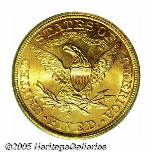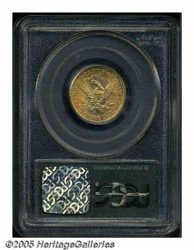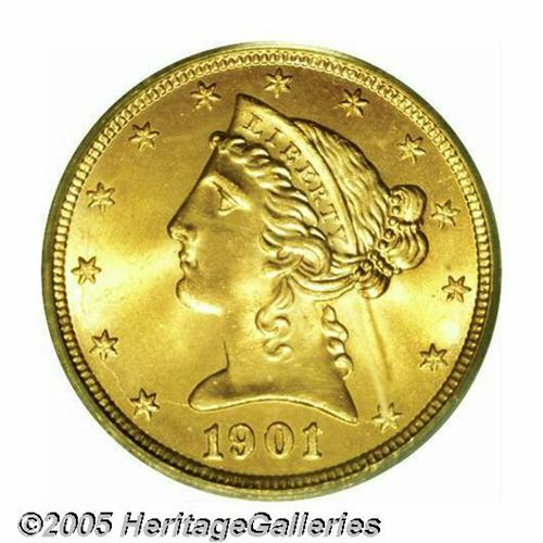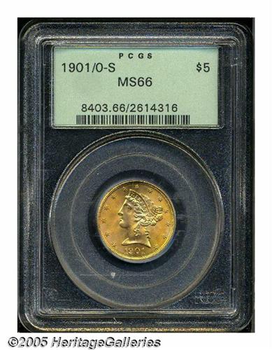 <B>1901/0-S<$5> MS66 PCGS.</B></I> This overdate is scarce in all grades with examples in the better grades of Mint State especially elusive. Only one other PCGS MS66 has been certified, and one by NGC with none finer (3/05). This is an especially lustrous coin and the centers are bright yellow-gold with deep orange-gold coloration elsewhere. Fully struck in all areas with no mentionable or noticeable abrasions on either side. The underdigit is pronounced to the upper right of the 1 in the date.