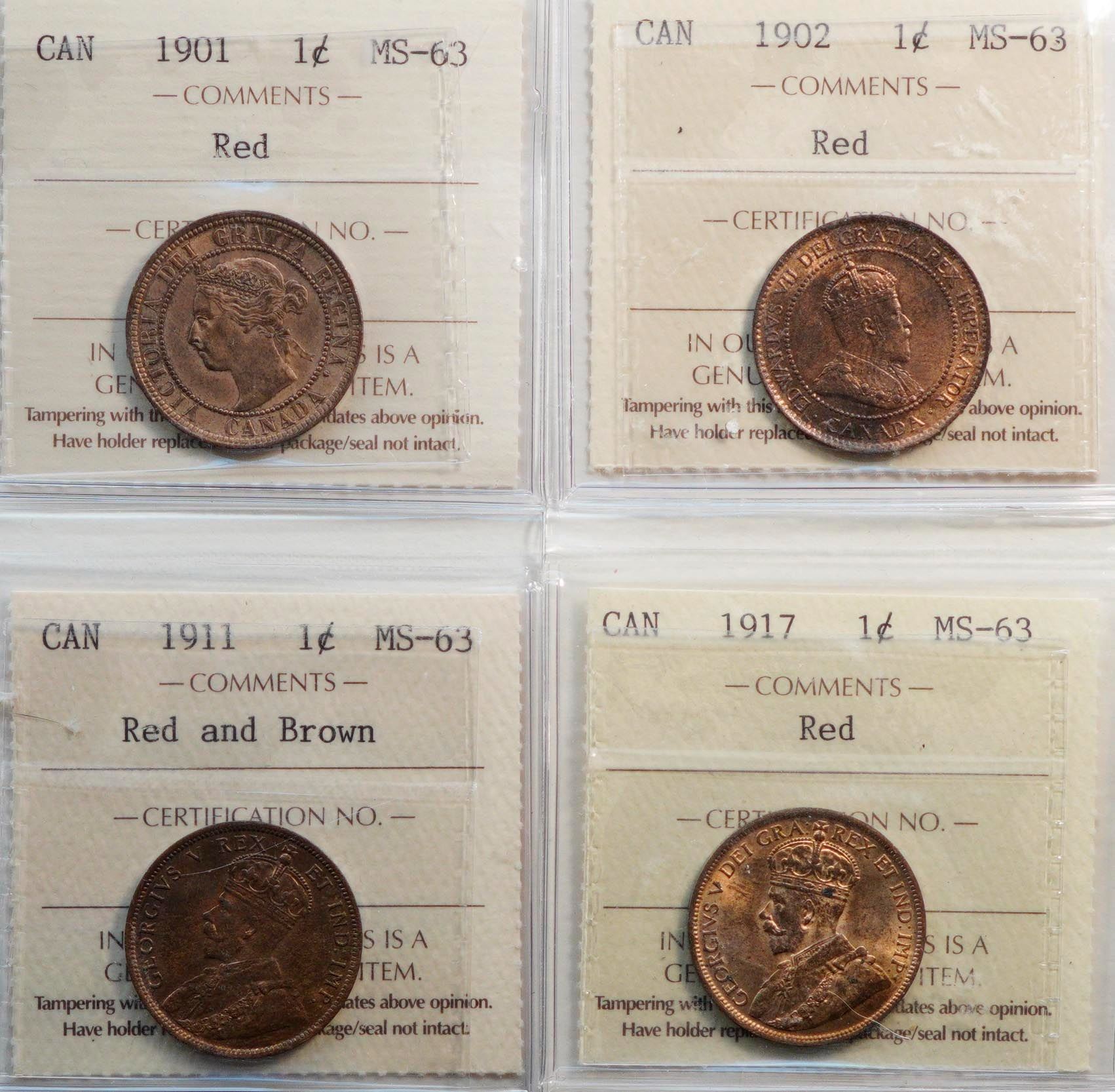 1901 1¢, 1902, 1911, 1917. All 4 coins ICCS Choice Mint State-63