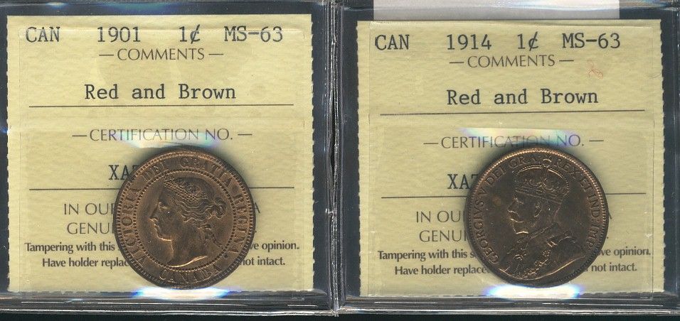 1901 1¢ & 1914 ICCS MS63RB. Lot of 2 coins.