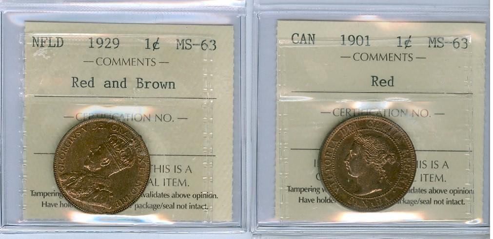 1901 1¢ & 1929 Nfld 1¢. Lot of 2 coins both ICCS MS63 Red and Red/Brown respectively.