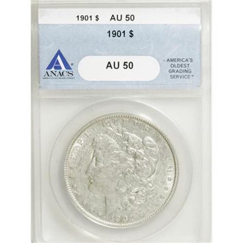 <B>1901 $1 AU50 ANACS.</B></I> NGC Census: (254/2423). PCGS Population (307/2143). Mintage: 6,962,813. Numismedia Wsl. Price for NGC/PCGS coin in AU50: $250. (#7272)<BR><BR><B>Coin Engraver:</B> George T. Morgan<BR><BR><b>Shipping:</b> Coins & Currency (<a target="_blank" href="http://www.heritageauctions.com/common/shipping.php">view shipping information</a>)
