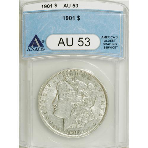 <B>1901 $1 AU53 ANACS.</B></I> NGC Census: (292/1950). PCGS Population (289/1688). Mintage: 6,962,813. Numismedia Wsl. Price for NGC/PCGS coin in AU53: $292. (#7272)<BR><BR><b>Shipping:</b> Coins & Currency (<a target="_blank" href="http://www.heritageauctions.com/common/shipping.php">view shipping information</a>)