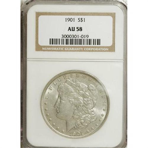 <B>1901 $1 AU58 NGC.</B></I> Admittedly, the highpoints of the hair have a mere whisper of friction, but many collectors would regard this Morgan dollar as Mint State. Cartwheel luster is unbroken, although slightly diminished on Liberty's cheek. Lightly toned and conditionally rare.<BR><BR><b>Shipping:</b> Coins & Currency (<a target="_blank" href="http://www.heritageauctions.com/common/shipping.php">view shipping information</a>)