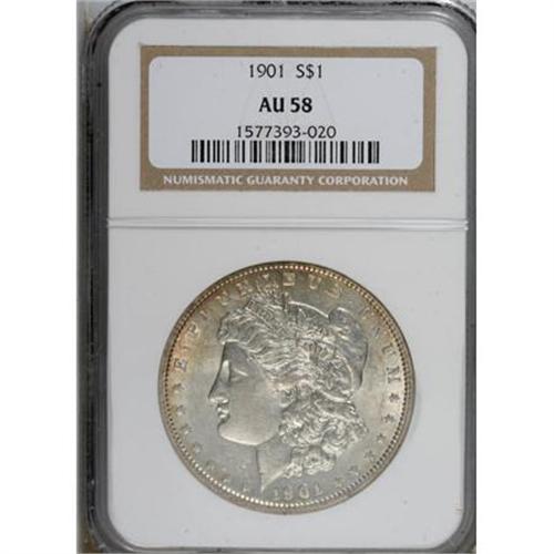 <B>1901 $1 AU58 NGC.</B></I> The fields of this lightly abraded dollar retain their original luster, though a touch of friction is present on the softly struck highpoints. Delicate gold and peach patina graces the margins, while the centers remain predominantly silver-gray.<BR><BR><B>Coin Engraver:</B> George T. Morgan<BR><BR><b>Shipping:</b> Coins & Currency (<a target="_blank" href="http://www.heritageauctions.com/common/shipping.php">view shipping information</a>)