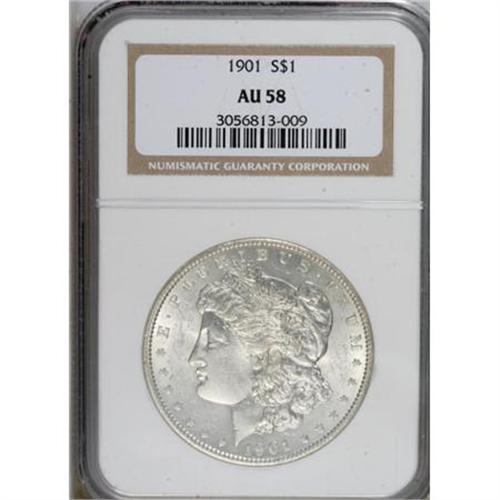 <B>1901 $1 AU58 NGC.</B></I> Silvery surfaces retain considerable luster. The design features exhibit a slightly better-than-average strike for this usually poorly struck issue. Both sides are quite clean.<BR><BR><B>Coin Engraver:</B> George T. Morgan<BR><BR><b>Shipping:</b> Coins & Currency (<a target="_blank" href="http://www.heritageauctions.com/common/shipping.php">view shipping information</a>)