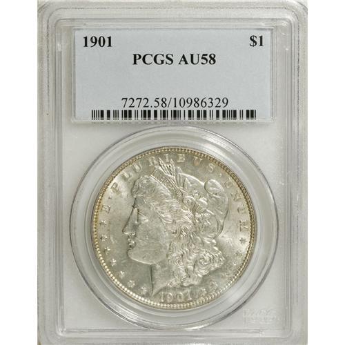 <B>1901 $1 AU58 PCGS.</B></I> This lightly circulated specimen possesses ample luster, and is untoned except for a sliver of yellow-gold color at portions of the rims. Excellent motif definition, and quite clean on both sides.<BR><BR><b>Shipping:</b> Coins & Currency (<a target="_blank" href="http://www.heritageauctions.com/common/shipping.php">view shipping information</a>)