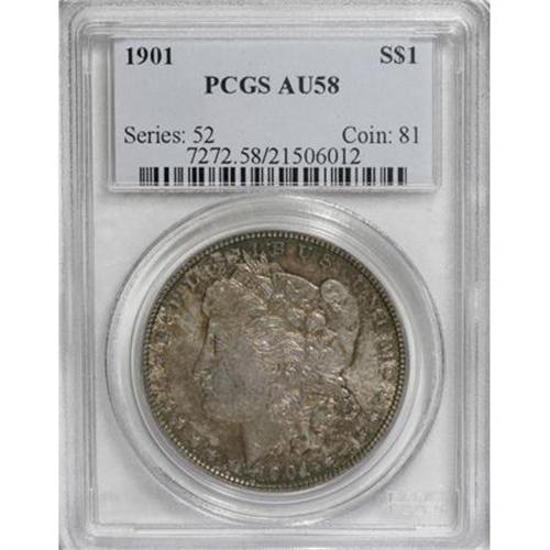 <B>1901 $1 AU58 PCGS.</B></I> The 1901 is a famous conditional rarity, plentiful in VF but elusive in Mint State. This example has satin cartwheel luster and dusky dove-gray, forest-green, and golden-brown toning. Distributed small marks on the face are of little concern.<BR><BR><b>Shipping:</b> Coins & Currency (<a target="_blank" href="http://www.heritageauctions.com/common/shipping.php">view shipping information</a>)