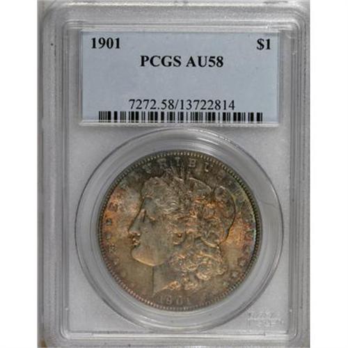 <B>1901 $1 AU58 PCGS.</B></I> The obverse is principally golden-brown, with glimpses of steel-gray on the profile and an arc of aquamarine along the upper border. The reverse is untoned and has a thin mark on the breast. Satiny and virtually Mint State <BR><BR><B>Coin Engraver:</B> George T. Morgan<BR><BR><b>Shipping:</b> Coins & Currency (<a target="_blank" href="http://www.heritageauctions.com/common/shipping.php">view shipping information</a>)