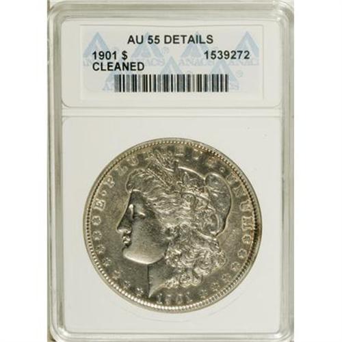 <B>1901 $1 --Cleaned--ANACS. AU55 Details.</B></I> NGC Census: (540/1456). PCGS Population (602/1082). Mintage: 6,962,813. Numismedia Wsl. Price for NGC/PCGS coin in AU55: $425. (#7272)<BR><BR><b>Shipping:</b> Coins & Currency (<a target="_blank" href="http://www.heritageauctions.com/common/shipping.php">view shipping information</a>)