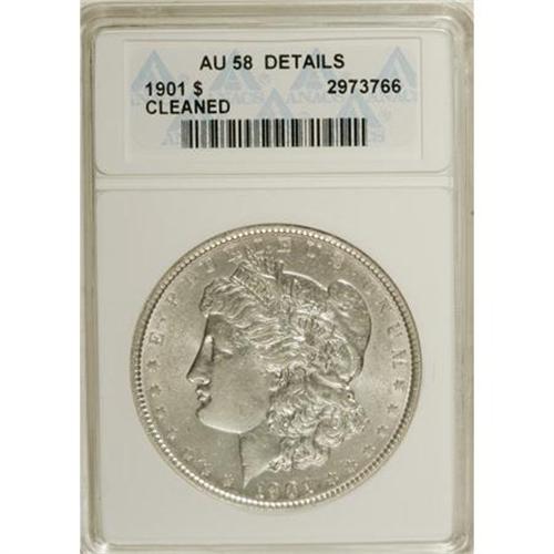 <B>1901 $1 --Cleaned--ANACS. AU58 Details.</B></I> NGC Census: (906/544). PCGS Population (609/473). Mintage: 6,962,813. Numismedia Wsl. Price for NGC/PCGS coin in AU58: $625. (#7272)<BR><BR><b>Shipping:</b> Coins & Currency (<a target="_blank" href="http://www.heritageauctions.com/common/shipping.php">view shipping information</a>)
