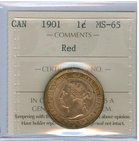 1901 1¢ ICCS MS65 Red, attactive and fully lustrous 90% red