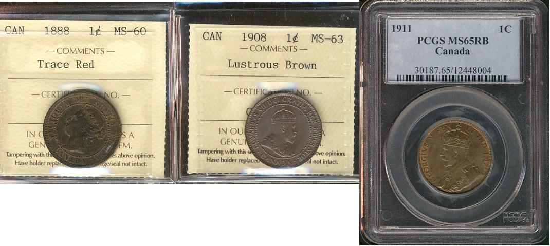1901 1¢ MS60, 1908 MS63 & 1911 MS65RB. Lot of 3 certified coins.