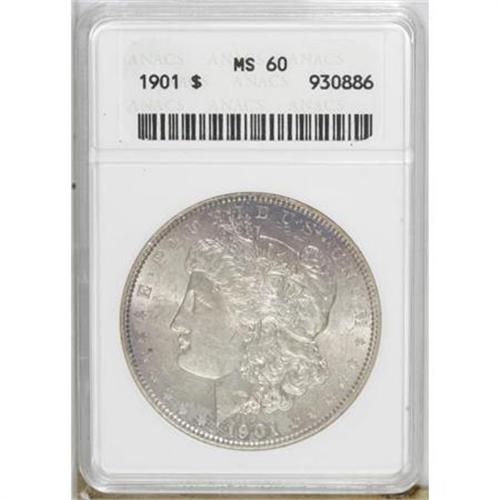 <B>1901 $1 MS60 ANACS.</B></I> This well struck and strongly lustrous piece shows no trace of wear. Both sides show luminous gray-gold patina with elements of lavender-blue and olive at the margins. Numerous light to moderate abrasions over each side account for the grade.<BR><BR><B>Coin Engraver:</B> George T. Morgan<BR><BR><b>Shipping:</b> Coins & Currency (<a target="_blank" href="http://www.heritageauctions.com/common/shipping.php">view shipping information</a>)