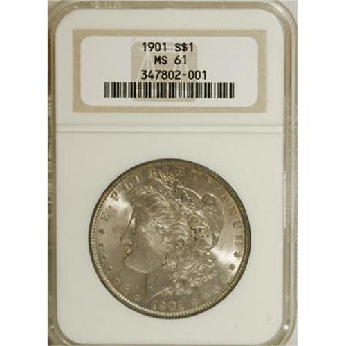 <B>1901 $1 MS61 NGC.</B></I> A highly regarded conditional rarity in Mint State, despite a seemingly plentiful mintage of nearly 7 million pieces. This well struck, lightly abraded example has a thin layer of toning over the strongly lustrous surfaces. Splashes of gunmetal toning accent the eagle.<BR><BR><B>Coin Engraver:</B> George T. Morgan<BR><BR><b>Shipping:</b> Coins & Currency (<a target="_blank" href="http://www.heritageauctions.com/common/shipping.php">view shipping information</a>)