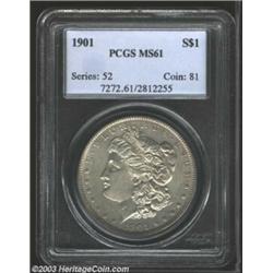 <TR><TD width="100%"><TABLE cellSpacing=1 cellPadding=3 width="100%" border=0><TBODY><TR><TD width="100%" bgColor=#79735c><FONT face=arial color=#ffffff size=3><B>Description</B> </FONT></TD></TR><TR><TD width="100%" bgColor=#ffffff><FONT face=arial size=2><B>1901 $1 MS61 PCGS.</B></I> Somewhat soft near the centers, this example exhibits an interesting shade of deep mauve-gray toning on each side. There are a relatively small number of superficial contact marks on smooth surfaces, leading one to think that the coin may be conservatively graded. Of the entire Morgan dollar series, the 1901 is one of the most difficult dates to locate in Mint State.<BR><I>From the CEO PCGS Morgan Dollar Registry Set.</B></I> </FONT></TD></TR></TBODY></TABLE></TD></TR></TBODY></TABLE><BR><A name=PricesRealized></A><TABLE cellSpacing=0 cellPadding=0 width="100%" bgColor=#000000 border=0><TBODY><TR><TD width="100%"><TABLE cellSpacing=1 cellPadding=3 width="100%" border=0><TBODY><TR><TD width="100%" bgColor=#79735c><A name=PR><FONT face=arial color=#ffffff size=3><B>Previous Prices from Heritage Auctions</B> </FONT></A></TD></TR><TR><TD bgColor=#f6f6ed><TABLE cellSpacing=0 cellPadding=0 width="100%" border=1><TBODY><TR><TD align=middle width="33%"><B>Date</B></TD><TD align=middle width="33%"><B>Service</B></TD><TD align=middle width="33%"><B>Price</B></TD></TR><TR bgColor=whitesmoke><TD width="33%"><B>06/08/2002</B></TD><TD width="33%">PCGS</TD><TD width="33%">$1,840.00</TD></TR><TR bgColor=whitesmoke><TD width="33%"><B>01/12/2002</B></TD><TD width="33%">PCGS</TD><TD width="33%">$1,782.50</TD></TR><TR bgColor=whitesmoke><TD width="33%"><B>03/16/1996</B></TD><TD width="33%">PCGS</TD><TD width="33%">$1,815.00</TD></TR><TR bgColor=whitesmoke><TD width="33%"><B>06/04/1993</B></TD><TD width="33%">PCGS</TD><TD width="33%">$1,485.00</TD></TR><TR bgColor=whitesmoke><TD width="33%"><B>02/23/2002</B></TD><TD width="33%">NGC</TD><TD width="33%">$1,380.00</TD></TR><TR bgColor=whitesmoke><TD width="33%"><B>03/06/2001</B></TD><TD width="33%">NGC</TD><TD width="33%">$1,450.00</TD></TR><TR bgColor=whitesmoke><TD width="33%"><B>01/05/2001</B></TD><TD width="33%">NGC</TD><TD width="33%">$1,265.00</TD></TR><TR bgColor=whitesmoke><TD width="33%"><B>08/13/1999</B></TD><TD width="33%">NGC</TD><TD width="33%">$1,495.00</TD></TR><TR bgColor=whitesmoke><TD width="33%"><B>04/07/2001</B></TD><TD width="33%">NGC</TD><TD width="33%">$1,322.50</TD></TR><TR bgColor=whitesmoke><TD width="33%"><B>06/01/1996</B></TD><TD width="33%">NGC</TD><TD width="33%">$1,815.00</TD></TR><TR bgColor=whitesmoke><TD width="33%"><B>11/01/1999</B></TD><TD width="33%">NGC</TD><TD width="33%">$1,300.00</TD></TR><TR bgColor=whitesmoke><TD width="33%"><B>07/29/1997</B></TD><TD width="33%">ANACS</TD><TD width="33%">$1,045.00</TD></TR><TR bgColor=whitesmoke><TD width="33%"><B>06/04/1999</B></TD><TD width="33%">ANACS</TD><TD width="33%">$1,380.00</TD></TR><TR bgColor=whitesmoke><TD width="33%"><B>04/24/1998</B></TD><TD width="33%">ANACS</TD><TD width="33%">$687.50</TD></TR><TR bgColor=whitesmoke><TD width="33%"><B>05/01/1999</B></TD><TD width="33%">ANACS</TD><TD width="33%">$1,495.00</TD></TR></TBODY></TABLE></TD></TR><TR><TD bgColor=#ffffff><FONT face=arial size=1 ?>PLEASE NOTE: All prices realized reflect the final hammer price PLUS the buyer's premium in auctions that charge a buyer's premium. Each item has a notation at the top of the listing indicating whether that lot included a buyer's premium. Example: A item that sells with a final hammer price of $100 and a 20% buyer's premium will display with a price realized of $120. All information listed is intended to be as accurate as possible, but errors are possible. Please use this guide carefully and inform us of any inaccuracies. </FONT></TD></TR></TBODY></TABLE></TD></TR></TBODY></TABLE><BR><TABLE cellSpacing=0 cellPadding=0 width="100%" bgColor=#000000 border=0><TBODY><TR><TD width="100%"><TABLE cellSpacing=1 cellPadding=3 width="100%" border=0><TBODY><TR><TD width="100%" bgColor=#79735c colSpan=6><FONT face=arial color=#ffffff size=3><B>Price Guide*</B> </FONT></TD></TR><TR bgColor=#f6f6ed><TD align=middle><B>Grade</B> </TD><TD align=middle><B>Coin World<BR>(Trends)</B> </TD><TD align=middle><B>Numismedia<BR>Retail</B> </TD><TD align=middle><B>Numismedia<BR>Wholesale</B> </TD><TD align=middle><B>Coin<BR>Universe</B> </TD><TD align=middle><B>Heritage<BR>Value Index</B> </TD></TR><TR bgColor=#ffffff><TD align=middle>60</TD><TD align=right>$1,875.00</TD><TD align=right>---</TD><TD align=right>$1,210.00</TD><TD align=right>$1,650.00</TD><TD align=right>$1,198.13</TD></TR><TR style="FONT-WEIGHT: bold" bgColor=#cccfdd><TD align=middle>61</TD><TD align=right>---</TD><TD align=right>---</TD><TD align=right>$1,675.00</TD><TD align=right>$2,850.00</TD><TD align=right>$2,531.56</TD></TR><TR bgColor=#ffffff><TD align=middle>62</TD><TD align=right>$4,500.00</TD><TD align=right>---</TD><TD align=right>$3,525.00</TD><TD align=right>$4,350.00</TD><TD align=right>$4,017.50</TD></TR><TR bgColor=#ffffff><TD colSpan=6><FONT size=1>*All information listed is intended to be as accurate as possible, but errors are possible. No item may be returned or refused based on this information which is provided as a service to our customers. You should contact each pricing source directly to determine the accuracy of this information. </FONT></TD></TR></TBODY></TABLE></TD></TR></TBODY></TABLE><BR><TABLE cellSpacing=0 cellPadding=0 width="100%" bgColor=#000000 border=0><TBODY><TR><TD width="100%"><TABLE cellSpacing=1 cellPadding=3 width="100%" border=0><TBODY><TR><TD width="100%" bgColor=#79735c><FONT face=arial color=#ffffff size=3><B>Population Guide</B> </FONT></TD></TR><TR bgColor=#ffffff><TD align=middle><!-- Begin Output of Population Grid--><TABLE cellSpacing=0 cellPadding=0 width="100%" border=0><TBODY><TR><TD vAlign=center><TABLE cellSpacing=0 width="100%" border=1 cellsadding="3"><TBODY><TR><TD vAlign=center><TABLE cellSpacing=0 cel