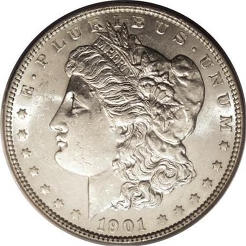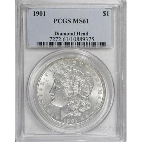 <B>1901 $1 MS61 PCGS.</B></I> Ex: Diamond Head. A stone-white and satiny example of this notorious conditional rarity. The reverse is well preserved except for an inconspicuous mark on the wreath beneath the fletchings. Close to 7 million 1901 dollars were struck, but examples must have been paid out early, since the 1901 is scarce in any grade and rare in Mint State.<BR><I>From the Diamond Head Registry Set of Prooflike Dollars.</B></I><BR><BR><B>Coin Engraver:</B> George T. Morgan<BR><BR><b>Shipping:</b> Coins & Currency (<a target="_blank" href="http://www.heritageauctions.com/common/shipping.php">view shipping information</a>\)