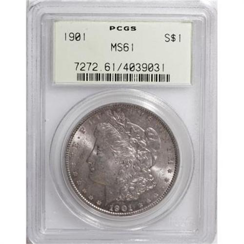 <B>1901 $1 MS61 PCGS.</B></I> A two olive reverse variety, caused by the use of two (slightly) different reverse hubs. A lustrous almond-gold example of this famous Mint State rarity, which carries a five-figure price tag in MS63 and hits six-figures in Gem condition. In an old green label holder.<BR><BR><B>Coin Engraver:</B> George T. Morgan<BR><BR><b>Shipping:</b> Coins & Currency (<a target="_blank" href="http://www.heritageauctions.com/common/shipping.php">view shipping information</a>)