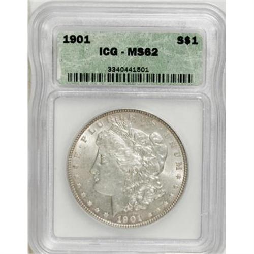 <B>1901 $1 MS62 ICG.</B></I> This key-date Philadelphia issue is difficult to locate in Mint State. This MS62 representative displays soft luster and is essentially untoned. A sharp strike leaves relatively strong definition on the design elements. A few minute, grade limiting marks are noted on each side.<BR><BR><B>Coin Engraver:</B> George T. Morgan<BR><BR><b>Shipping:</b> Coins & Currency (<a target="_blank" href="http://www.heritageauctions.com/common/shipping.php">view shipping information</a>)