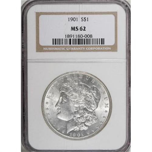 <B>1901 $1 MS62 NGC.</B></I> The conditional rarity of the 1901 dollar is well known beyond collectors of Morgans. For some reason, the 1901 and the 1884-S seem to have been "struck in AU," with precious few coins known in mint condition. This piece is well defined and brilliant with attractive, satin-like mint luster. A few small, scattered abrasions account for the grade. An important coin for the Morgan dollar collector.<BR><BR><B>Coin Engraver:</B> George T. Morgan<BR><BR><b>Shipping:</b> Coins & Currency (<a target="_blank" href="http://www.heritageauctions.com/common/shipping.php">view shipping information</a>)