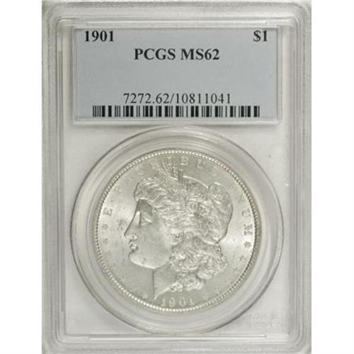 <B>1901 $1 MS62 PCGS.</B></I> Only two years separate the 1899 from the 1901, yet the low mintage 1899 is plentiful in Mint State, while the high mintage 1901 is rare in Uncirculated grades. Such inconsistencies are frequent within the Morgan dollar series, since the status of an issue depended on its distribution pattern as much as its original mintage. The present example is lustrous and friction-free, and has only a hint of toning. Minor marks on the left obverse are unimportant for the grade.<BR><BR><b>Shipping:</b> Coins & Currency (<a target="_blank" href="http://www.heritageauctions.com/common/shipping.php">view shipping information</a>)