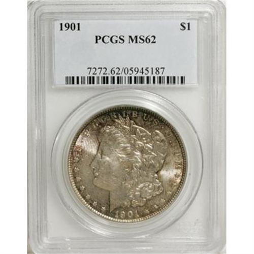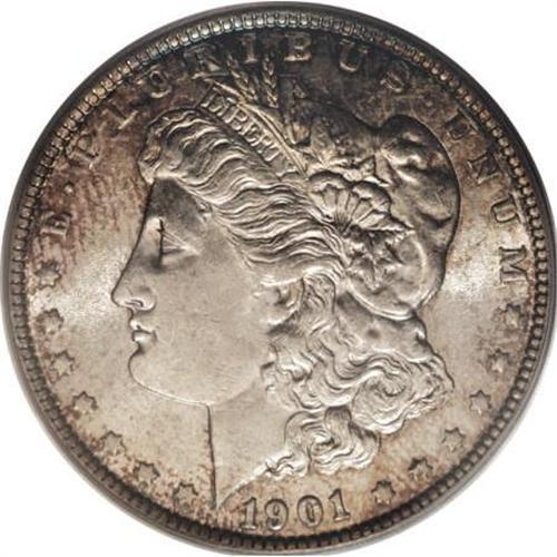 <B>1901 $1 MS62 PCGS.</B></I> Both Miller and Bowers single out the 1896-O and 1901 Morgan dollars for their various problems. However, the present example shows good luster and color, despite the remains of a old fingerprint to the left of Liberty, in the russet-gold patina. There is no trace of wear, but the strike is typical for the issue, and the reverse shows a pebbly texture under a loupe, the result of die erosion. A few visible abrasions on Liberty's cheek and the eagle's breast confirm the grade. This piece is nonetheless a nicer piece than the technical description would indicate.<BR><BR><B>Coin Engraver:</B> George T. Morgan<BR><BR><b>Shipping:</b> Coins & Currency (<a target="_blank" href="http://www.heritageauctions.com/common/shipping.php">view shipping information</a>\)