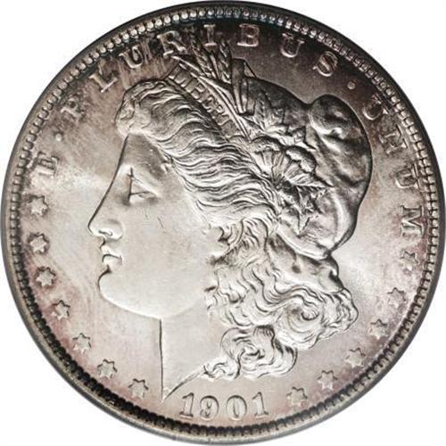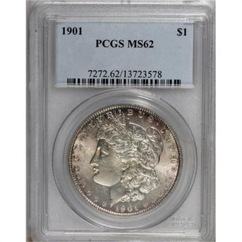 <B>1901 $1 MS62 PCGS.</B></I> Whispers of purple toning collect at the margins, and are slightly deeper and more extensive on the obverse, where they are joined by slivers of electric-blue. Generally well struck, with lustrous surfaces that yield a few minute contact marks. David Bowers (2006) says the 1901 is "Exceedingly rare in Mint State."<BR><BR><B>Coin Engraver:</B> George T. Morgan<BR><BR><b>Shipping:</b> Coins & Currency (<a target="_blank" href="http://www.heritageauctions.com/common/shipping.php">view shipping information</a>)