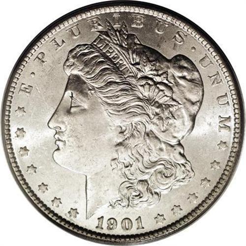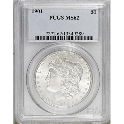 <B>1901 $1 MS62 PCGS. CAC.</B></I> The striking details are generally bold, even though the eagle's breast feathers are flat. Coruscating luster across each side increases the overall allure of the piece. Untoned with typical marks for the grade and scattered milky flecks in the fields. The 1901 Morgan dollar is a legendary key date, and the rarest of all Philadelphia issues (except for the problematic 1895) in Mint State. <BR><BR><B>Coin Engraver:</B> George T. Morgan<BR><BR><b>Shipping:</b> Coins & Currency (<a target="_blank" href="http://www.heritageauctions.com/common/shipping.php">view shipping information</a>)