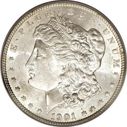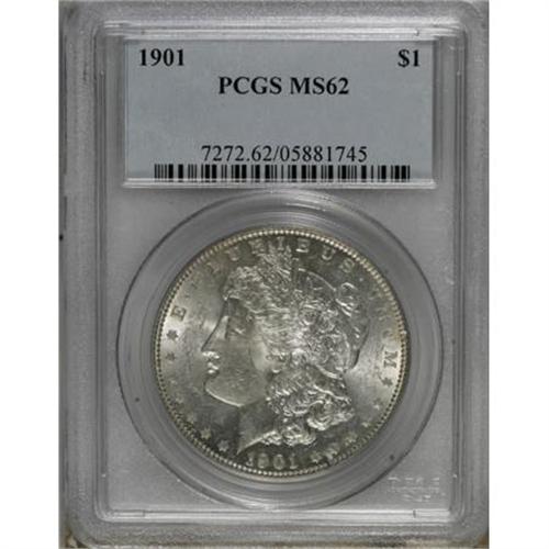 <B>1901 $1 MS62 PCGS.</B></I> Well-defined for the issue with powerful luster and surprising eye appeal. Though a number of light to moderate marks appear on each side, the overall appearance is solid. Minimally toned save for occasional dabs of golden-tan. The 1901 Morgan dollar, while available in lesser grades, becomes elusive in Mint State.<BR><BR><B>Coin Engraver:</B> George T. Morgan<BR><BR><b>Shipping:</b> Coins & Currency (<a target="_blank" href="http://www.heritageauctions.com/common/shipping.php">view shipping information</a>)