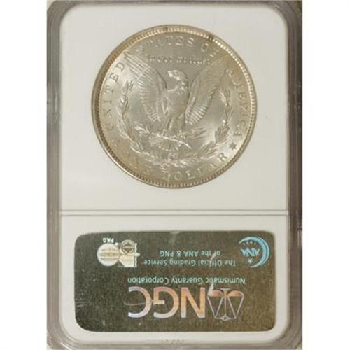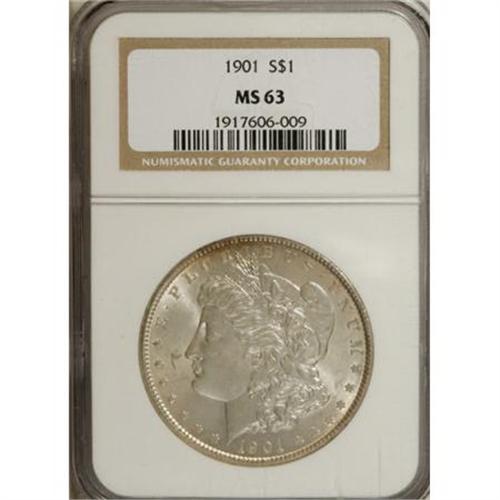 <B>1901 $1 MS63 NGC.</B></I> In his efforts to trace the releases of Morgan dollars, David Bowers in his book <I>American Coin Treasures and Hoards</B></I>, sums up the information on 1901 releases saying, "So far as is known, this date was not represented in any Treasury releases of the 1940s, 1950s or the remarkable early 1960s." <I>Numismatic News</B></I> columnist Paul Green, in a January 9, 2007 article, writes: "... we cannot say with certainty the 1901 was not released. We can simply suggest that if released, it was not reported."<BR> The bright lustrous surfaces on the Select example in the current lot display touches of golden-tan color at the margins, framing the untoned centers. Sharp definition characterizes the design elements, save for minor softness on the eagle's breast. A few minute obverse marks define the grade.<BR><BR><B>Coin Engraver:</B> George T. Morgan<BR><BR><b>Shipping:</b> Coins & Currency (<a target="_blank" href="http://www.heritageauctions.com/common/shipping.php">view shipping information</a>\)