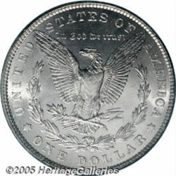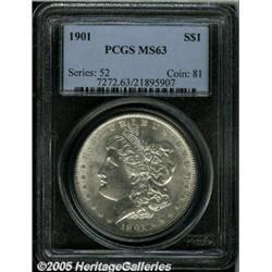 <B>1901<img border='0' src='http://www.heritagecoins.com/images/star.gif' width=10 height=10>$1 MS63 PCGS.</B></I> The 1901-P is one of the premier condition rarities in the series. Very few strictly Uncirculated coins are known today, although a great many AU pieces are extant with just a hint of friction. This piece has fully intact satiny mint luster, and the only disturbances in the fabric of the coin are a few small abrasions from contact with other coins. A bit weakly struck in the centers, as one might expect, each side is unusually bright for this often-dull issue without a hint of color or patina. Population: 73 in 63, 21 finer (2/05).