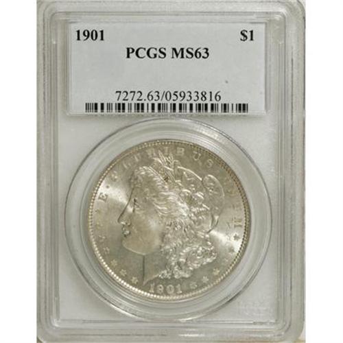 <B>1901 $1 MS63 PCGS.</B></I> The Morgan dollar series poses numerous pitfalls for the unknowing collector, and legions of beginners have discovered that their bargain-priced "1893-S" or "1889-CC" pieces were nothing of the sort. Whereas many alterations to Morgan dollars focus on adding a mintmark, the 1901 is distinctive among regular issues in that fraudsters attempt to increase perceived value by removing that feature.<BR> The present Select example is not only unquestionably authentic; it is also undeniably appealing and highly desirable as a Mint State survivor of an immensely challenging issue. The luster is surprisingly strong beneath whispers of rose-tinged haze, and the strike is appreciably above-average. Highly elusive any finer, with just 23 such pieces certified by PCGS (1/08).<BR><I>From The Oxford Collection.</B></I><BR><BR><B>Coin Engraver:</B> George T. Morgan<BR><BR><b>Shipping:</b> Coins & Currency (<a target="_blank" href="http://www.heritageauctions.com/common/shipping.php">view shipping information</a>)