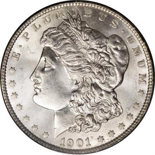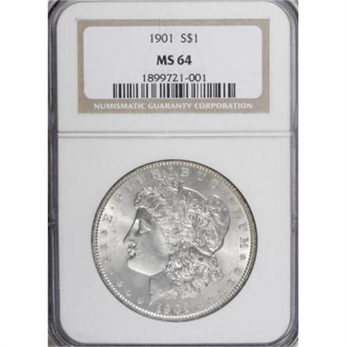 <B>1901 $1 MS64 NGC.</B></I> The 1901 Morgan dollar, from a mintage of 6,962,000 pieces, is readily available in circulated grades, but Mint State pieces are rare. At the MS64 level, the 1901 emerges as one of the keys to the set. In this regard, Paul Green, in the January 9, 2007 edition of <I>Numismatic News</B></I>, wrote an article entitled "1901 Morgan $1 Value Contrary to Mintage," in which he attempts to determine "... why a coin with a nearly 7 million mintage is priced like it had a mintage of 70,000."<BR> The immediate question is what happened to the nearly 7 million 1901 examples. Green says: <BR><BR>"At least part of the answer can be found in the fact that the 1901 is relatively available in circulated grades today. The presence of so many circulated examples leads to the first conclusion that at some period, perhaps around 1901, there were many 1901s in circulation. The second logical conclusion is that the 1901 was destroyed in large numbers in the Pittman Act melting. There is never certainty when it comes to that subject, but the 1901 had to have been melted and in large numbers."<BR><BR>Along this vein, David Bowers, in his 2006 <I>A Buyer's Guide to Silver Dollars & Trade Dollars of the United States, </B></I>says of the estimated quantity of 1901 dollars melted: "Possibly about 5,000,000 under the 1918 Pittman Act."<BR> There were apparently quality-control problems in the production of 1901 Morgans. Bowers writes in his 1993 <I>Silver Dollars and Trade Dollars of the United States</B></I> that: "Most Mint State 1901 dollars are poorly struck and have inadequate luster."<BR> The current near-Gem does not fit the 1901 Morgan profile given by Bowers. Instead, it displays radiant luster and sharply struck design elements. Most of the hair strands over Liberty's ear are well delineated, as are the eagle's breast feathers. Essentially untoned surfaces reveal just a few minute marks. Census: 16 in 64, 3 finer (6/07).<BR><BR><B>Coin Engraver:</B> George T. Morgan<BR><BR><b>Shipping:</b> Coins & Currency (<a target="_blank" href="http://www.heritageauctions.com/common/shipping.php">view shipping information</a>\)