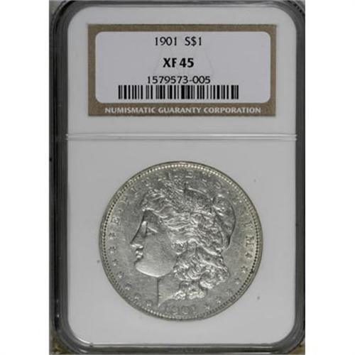 <B>1901 $1 XF45 NGC.</B></I> . NGC Census: (167/2687). PCGS Population (205/2482). Mintage: 6,962,813. Numismedia Wsl. Price for NGC/PCGS coin in XF45: $147. (#7272)<BR><BR><B>Coin Engraver:</B> George T. Morgan<BR><BR><b>Shipping:</b> Coins & Currency (<a target="_blank" href="http://www.heritageauctions.com/common/shipping.php">view shipping information</a>)
