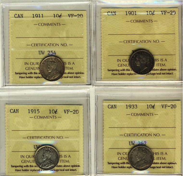 1901 10¢, 1911, 1915 & 1933 ICCS VF20. Lot of 4 coins.