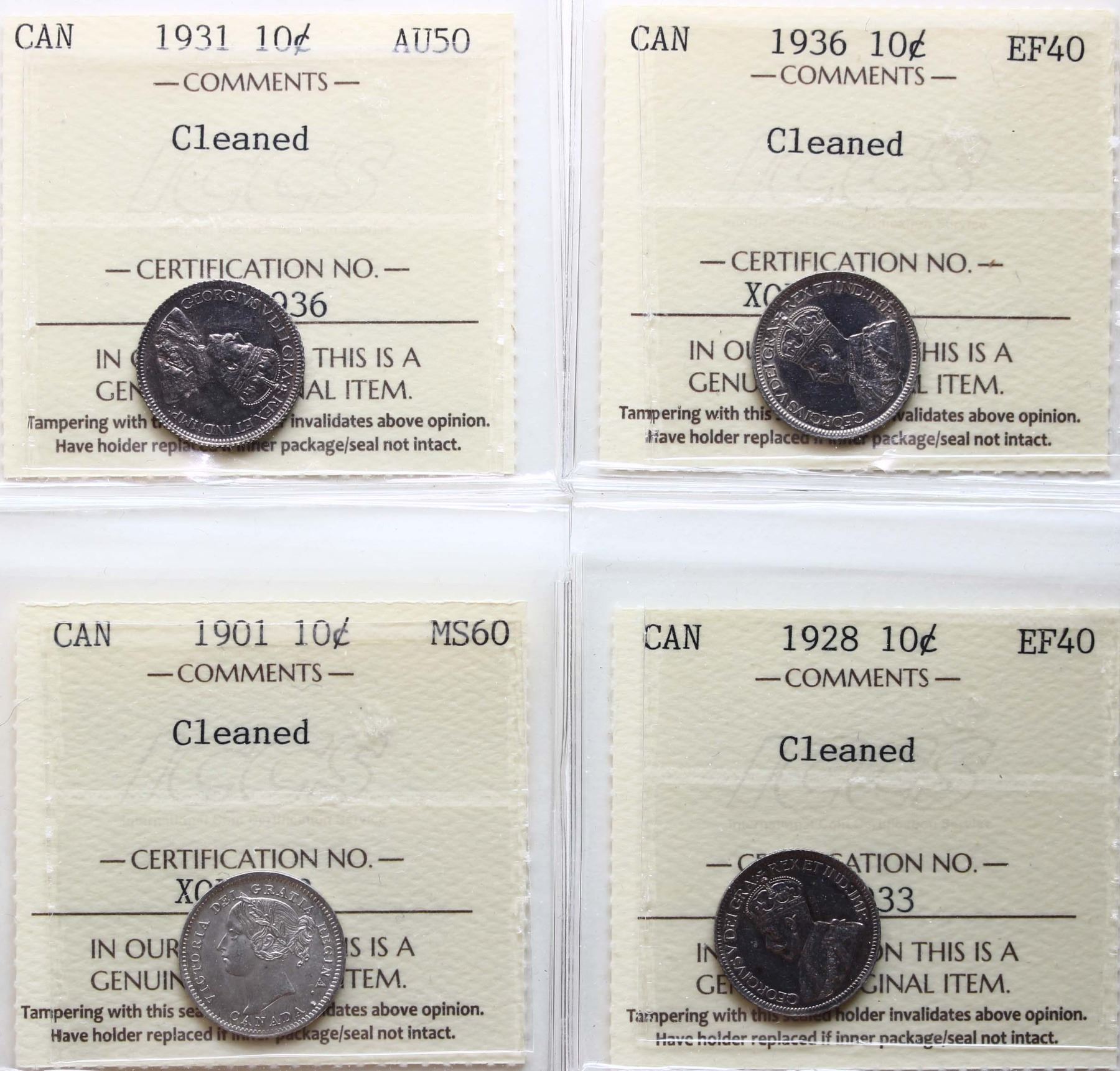 1901 10¢, 1928, 1931, 1936. Lot of 4 coins ICCS Mint State-60 cleaned.