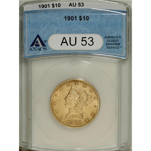 <B>1901 $10 AU53 ANACS.</B></I> NGC Census: (3/16830). PCGS Population (9/11851). Mintage: 1,718,825. Numismedia Wsl. Price: $336. (#8747)<BR><BR><b>Shipping:</b> Coins & Currency (<a target="_blank" href="http://www.heritageauctions.com/common/shipping.php">view shipping information</a>)