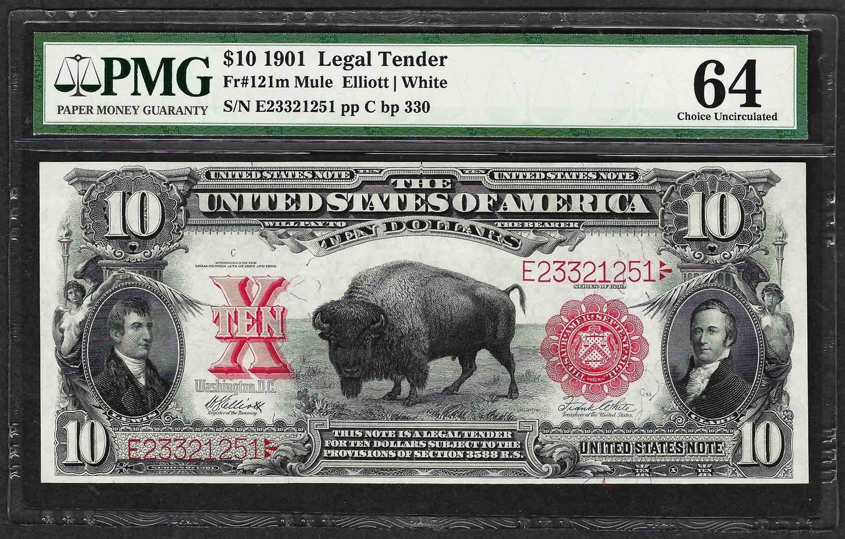 One 1901 $10 Bison Legal Tender Note Fr.121m Mule PMG Choice Uncirculated 64. PMG Certified.