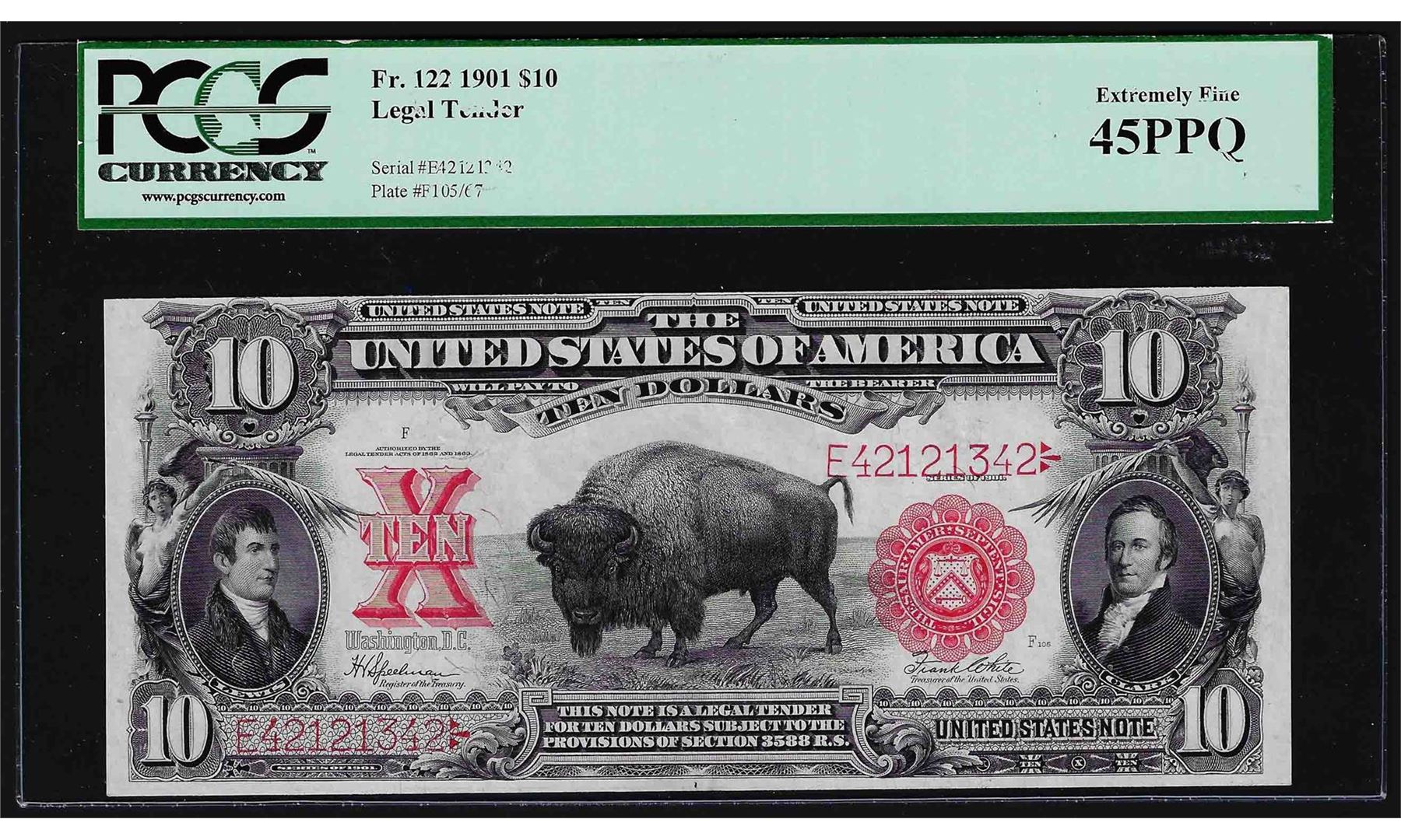 One 1901 $10 Bison Legal Tender Note Fr.122 PCGS Extremely Fine 45PPQ. PCGS Graded.