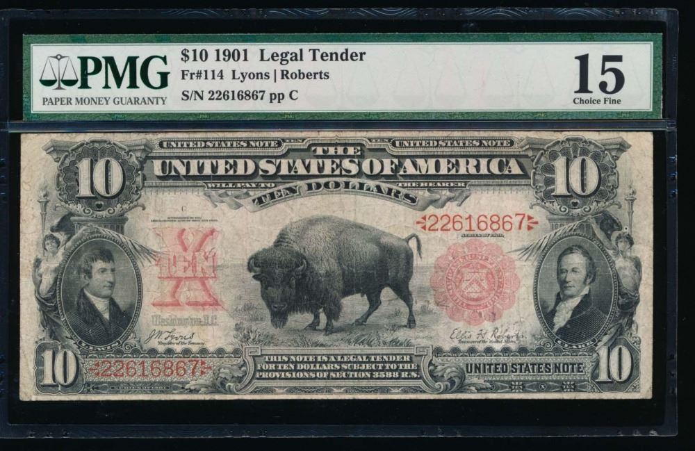 One 1901 $10 Bison Legal Tender Note PMG 15.