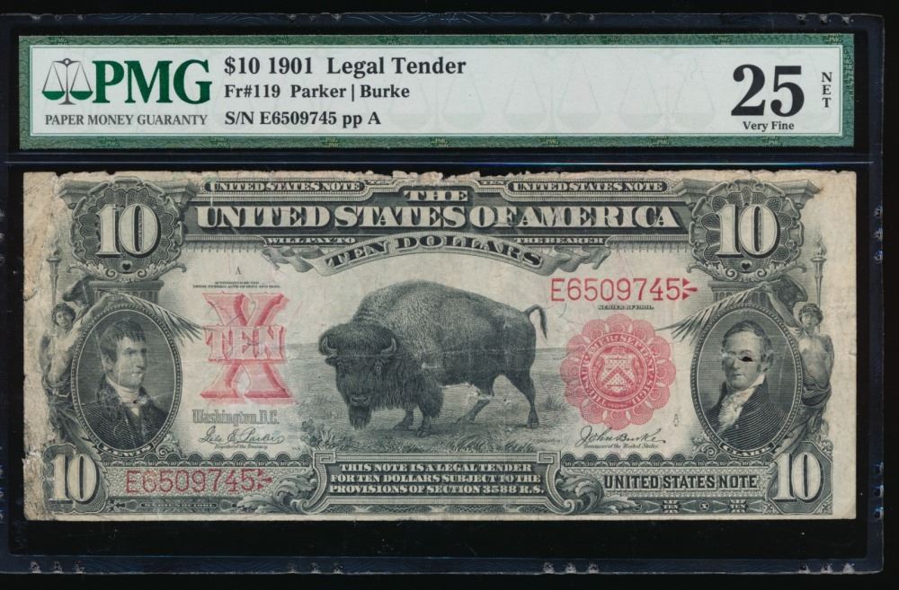 One 1901 $10 Bison Legal Tender Note PMG 25NET.
