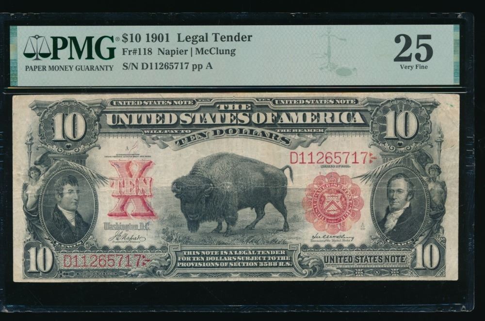 One 1901 $10 Bison Legal Tender Note PMG 25.