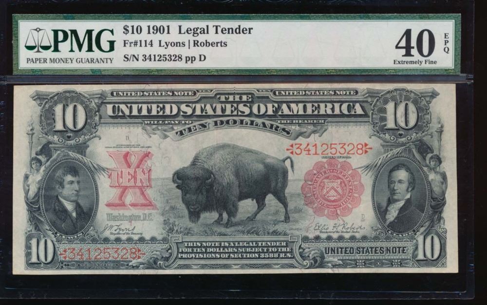 One 1901 $10 Bison Legal Tender Note PMG 40EPQ.