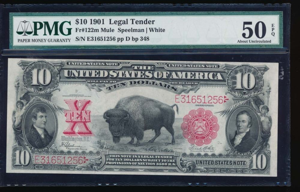 One 1901 $10 Bison Legal Tender Note PMG 50EPQ.